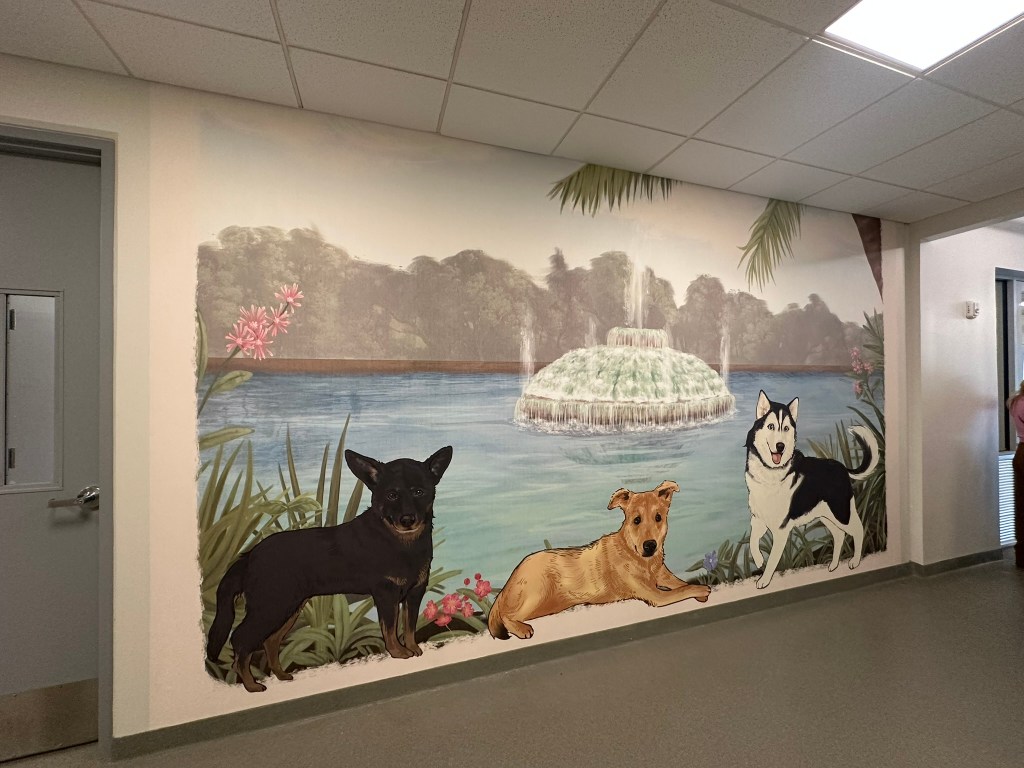 A colorful mural, featuring dogs and the Lake Eola Park fountain, liven up one of the walls at the Pet Alliance of Greater Orlando’s new shelter. Photo by Sandra Carr.
