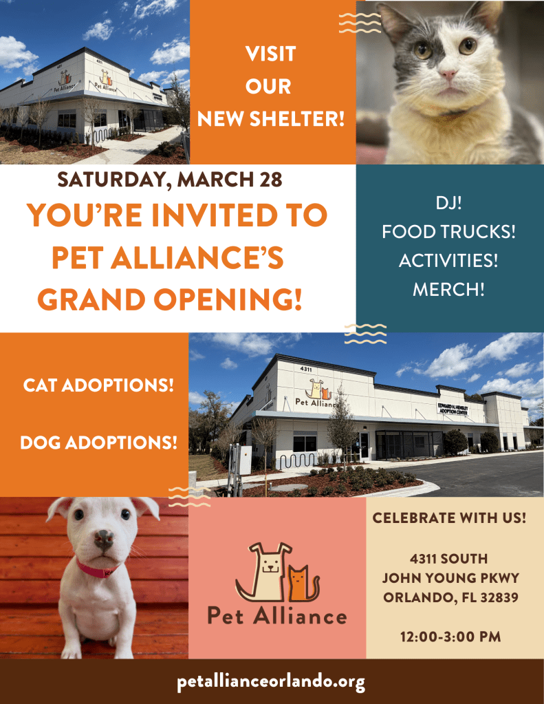 The Pet Alliance will be having a ribbon-cutting ceremony on Saturday, March 28 at 10 a.m. followed by a grand-opening “pawty” for the public at its new shelter, located at 4311 S. John Young Parkway in Orlando, from noon to 3 p.m. The event will include pet adoptions, activities, a DJ spinning the beats, food trucks and merchandise.